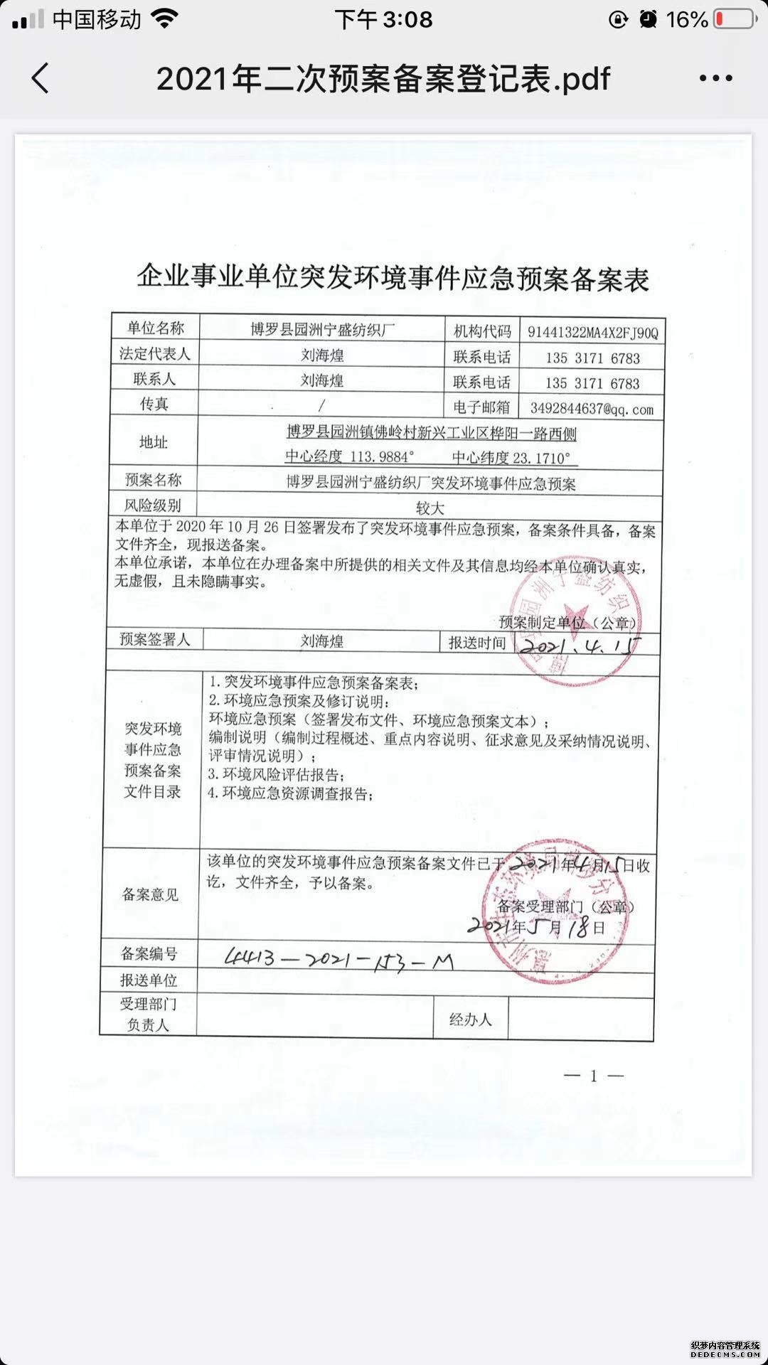 附件鏈接: 《博羅縣園洲寧盛紡織廠突發(fā)環(huán)境事件應急預案備案登記表》