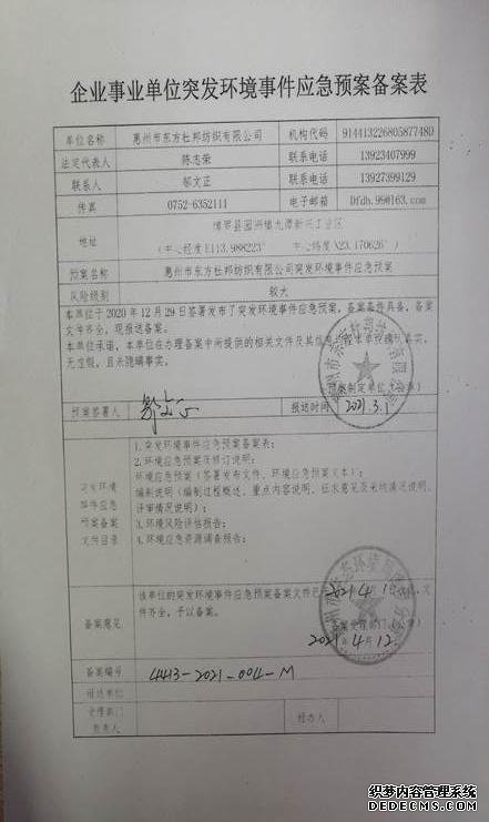 已制訂《惠州市東方杜邦紡織有限公司環(huán)境風險評估報告》,并于2021年4月12日上報博羅縣環(huán)境保護局備案;