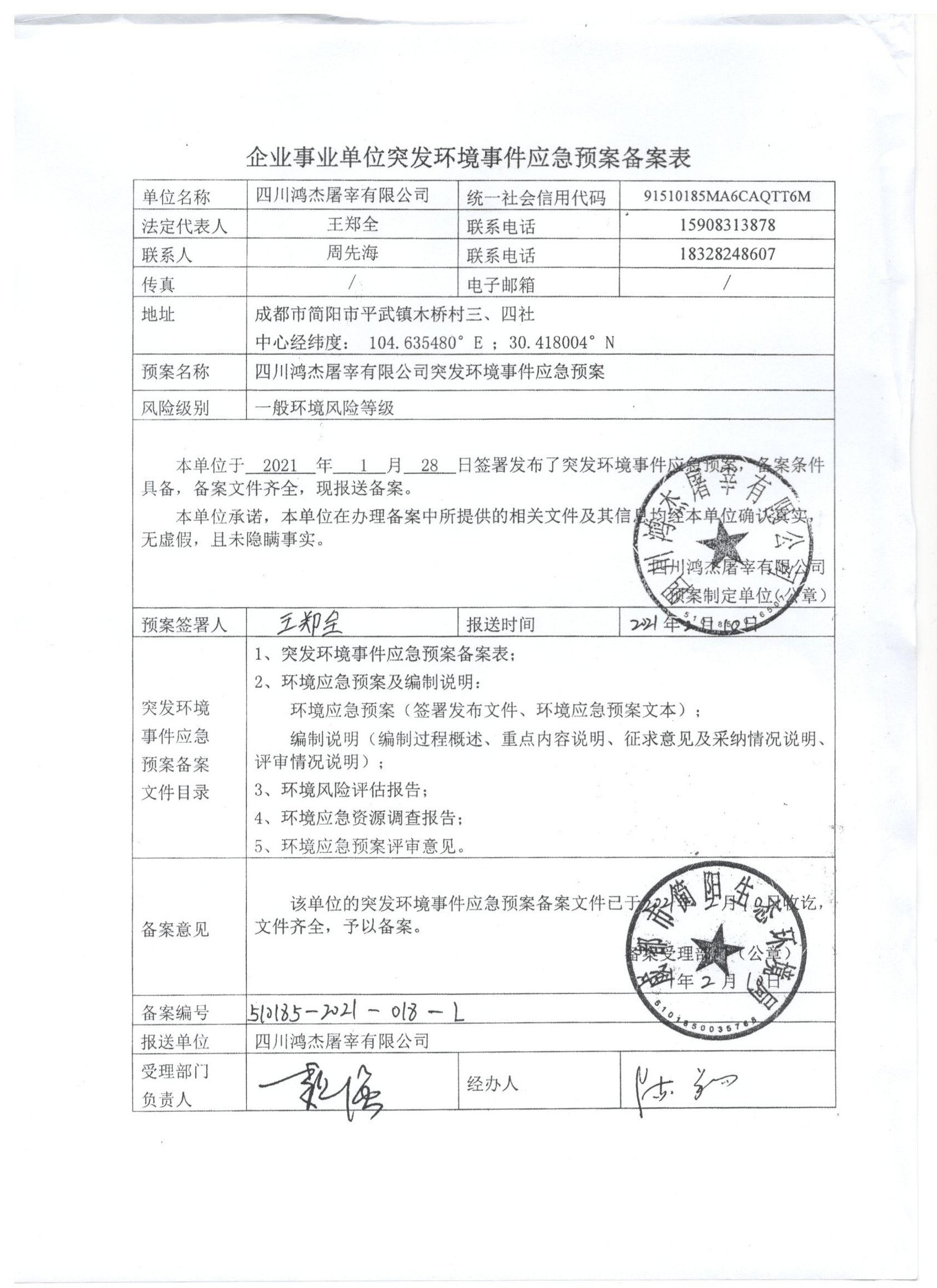 已制訂《四川鴻杰屠宰有限公司突發(fā)環(huán)境事件應急預案》,并于2021年 2月 12日在成都市簡陽生態(tài)環(huán)境局備案, 備案編號:510185-2021-018-L |
